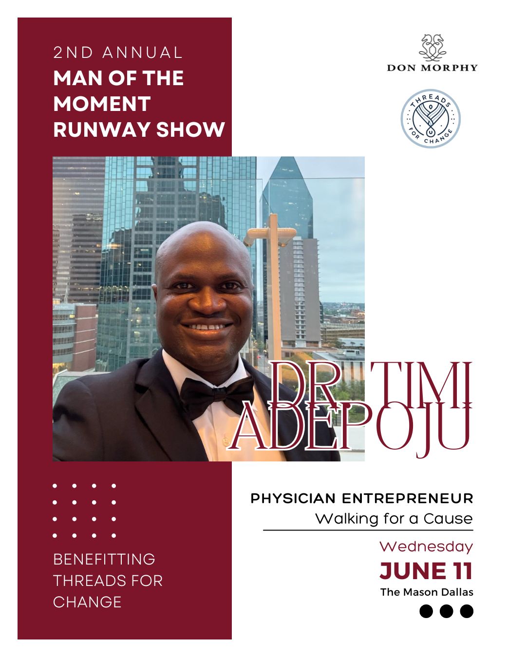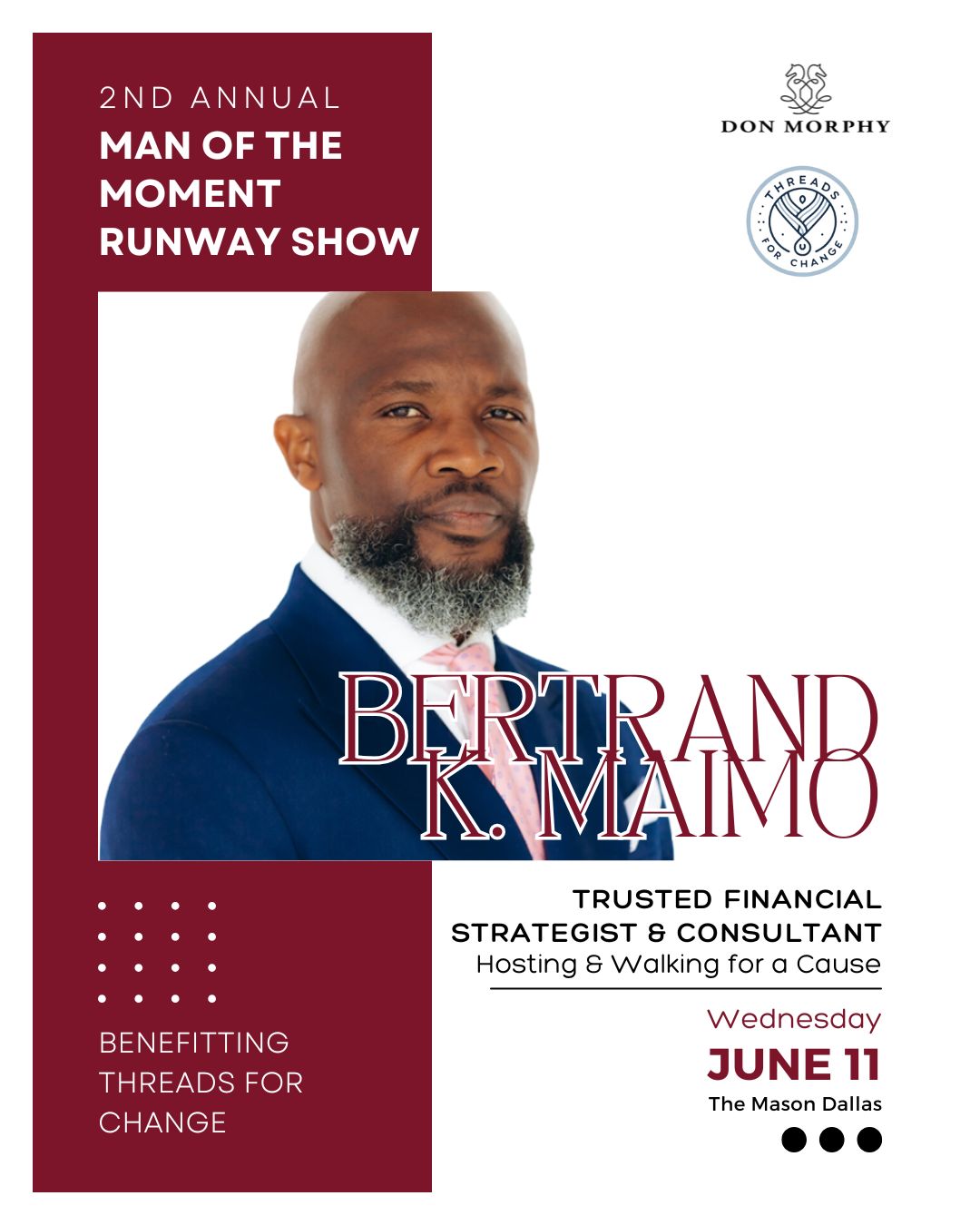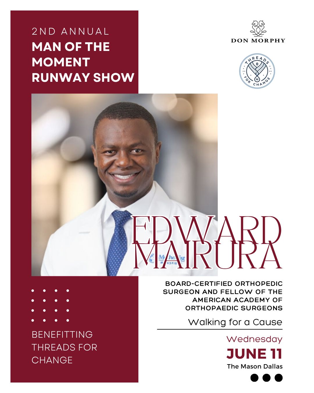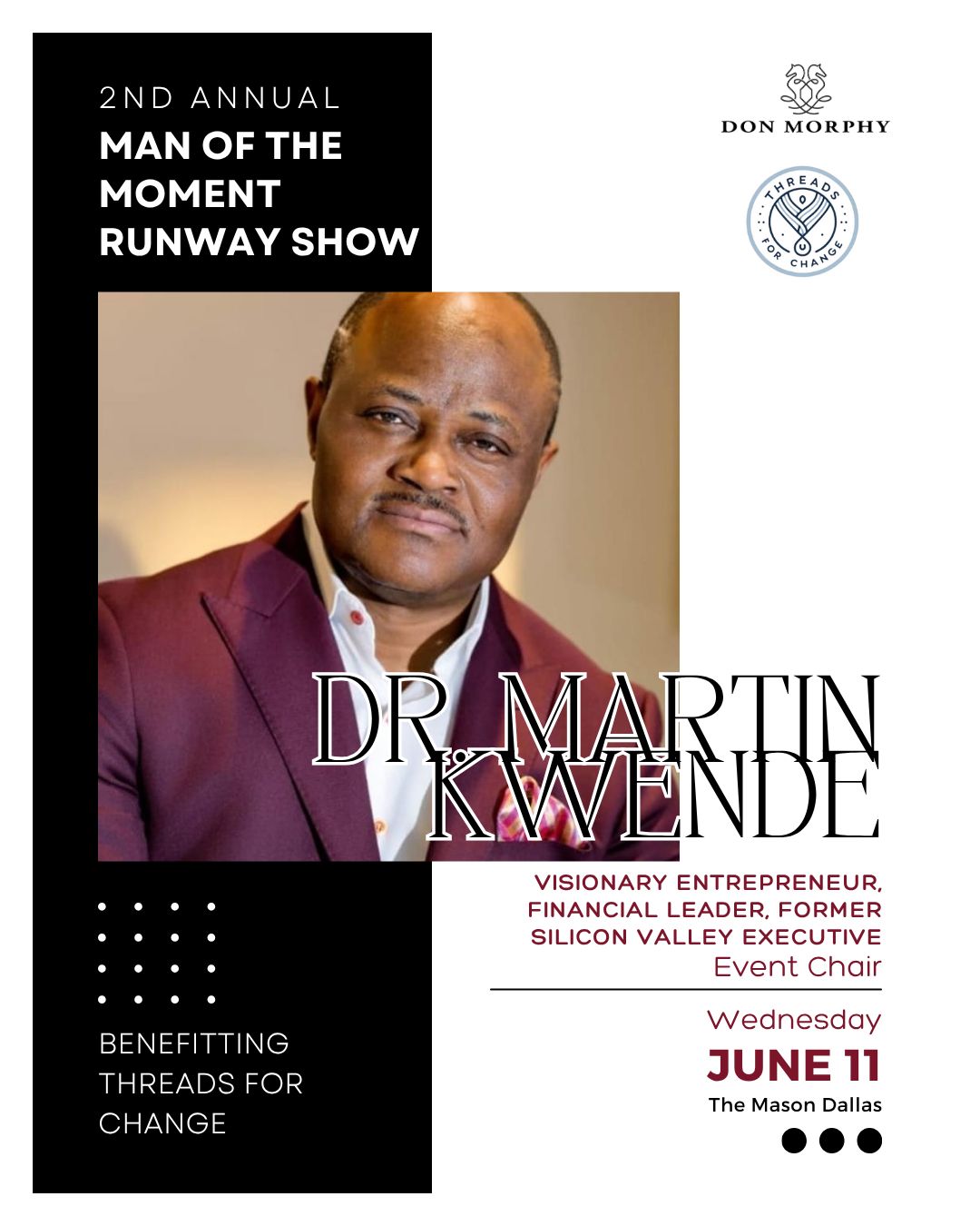 As Event Chair, Dr. Martin Kwende embodies the very spirit of Threads for Change - using fashion, education, and opportunity to empower lives. With his leadership, this year's initiatives will go beyond the runway to spark real, lasting change.